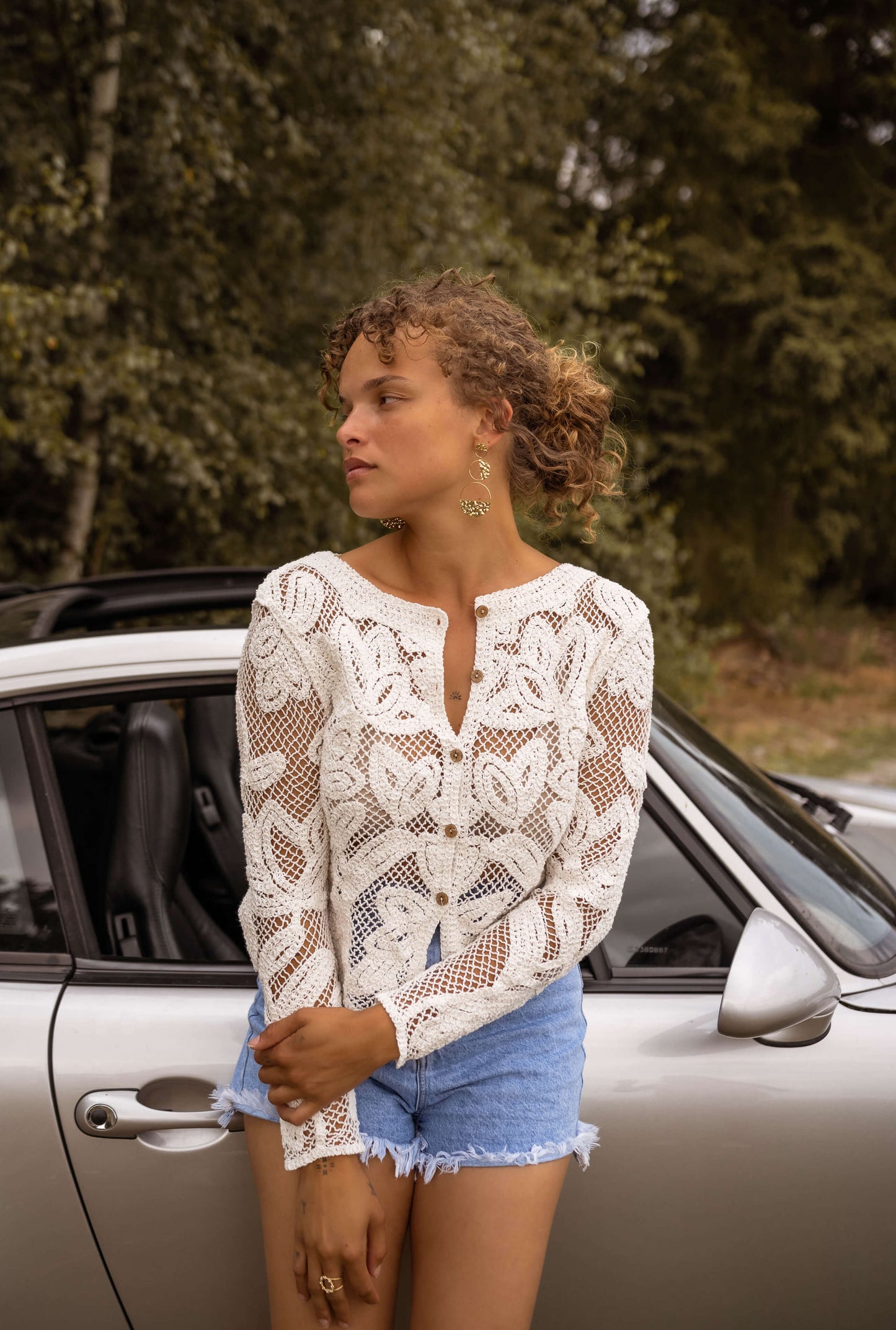 - Our elegant cardigan, beautifully crafted with intricate crochet details and designed with long sleeves for added warmth and style. Adorned with a row of charming brown buttons. The sheer fabric adds a hint of allure, making it a perfect layering piece for any occasion (skin tone bra recommended). Stay cozy and fashionable with this versatile cardigan that effortlessly combines comfort and sophistication!