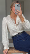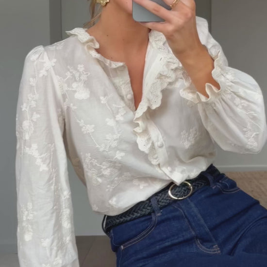 - Chic ecru shirt with embroidered detailing, ruffles on neckline that features buttoning tabs as well as on the wrists. Effortless sophistication for a stylish statement.