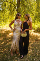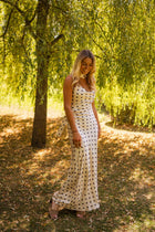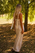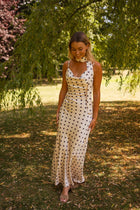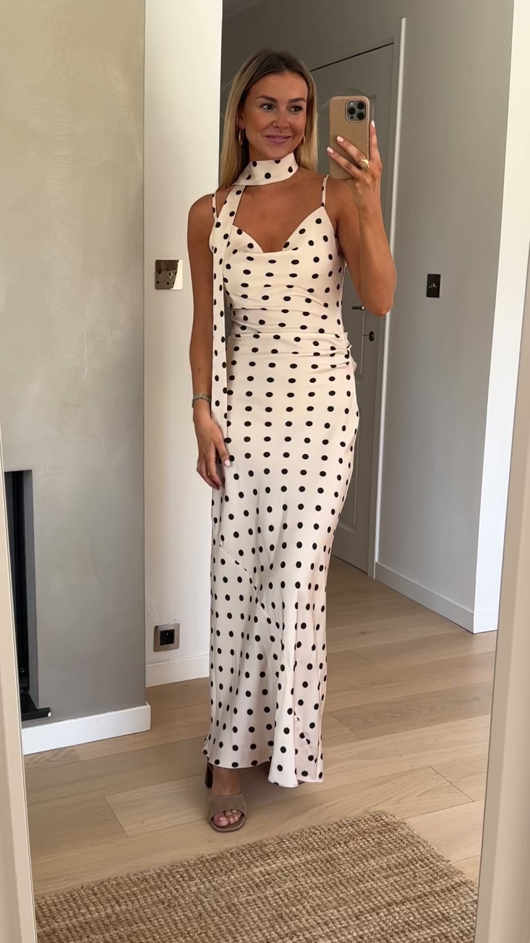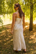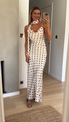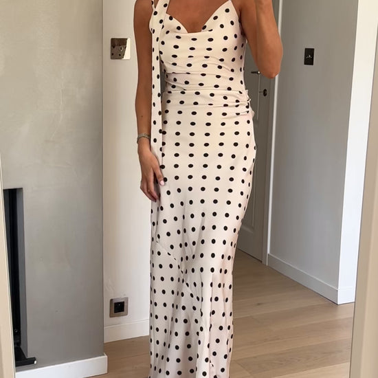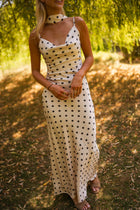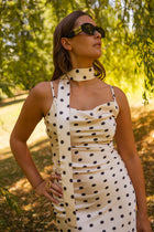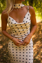 Chic and feminine, the Ecru Polka Dots Albane Dress features removable scarf for styling versatility. Designed with thin adjustable straps and a soft silk-like fabric, it showcases a flattering draped front and form-fitting cut with a convenient side zipper.