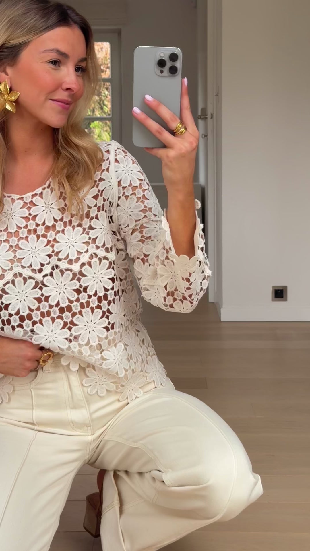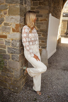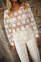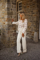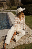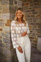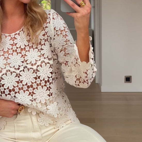 • Delicate and detailed, the Ecru Thalia Blouse is a showpiece of embroidery. Designed with long, slightly flared sleeves and a classic crewneck, its transparent fabric adds a touch of allure, perfect for layering or making a statement on its own