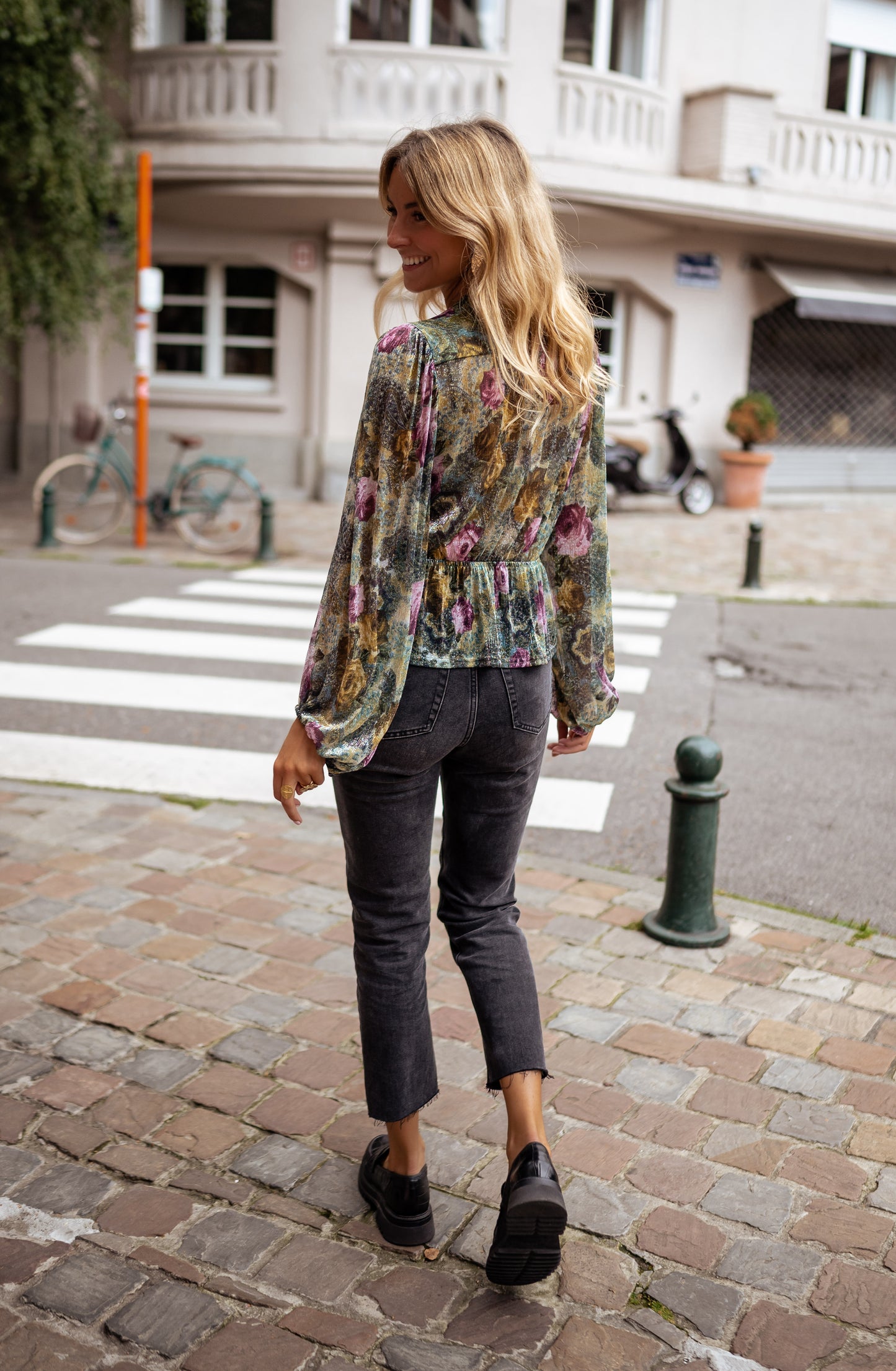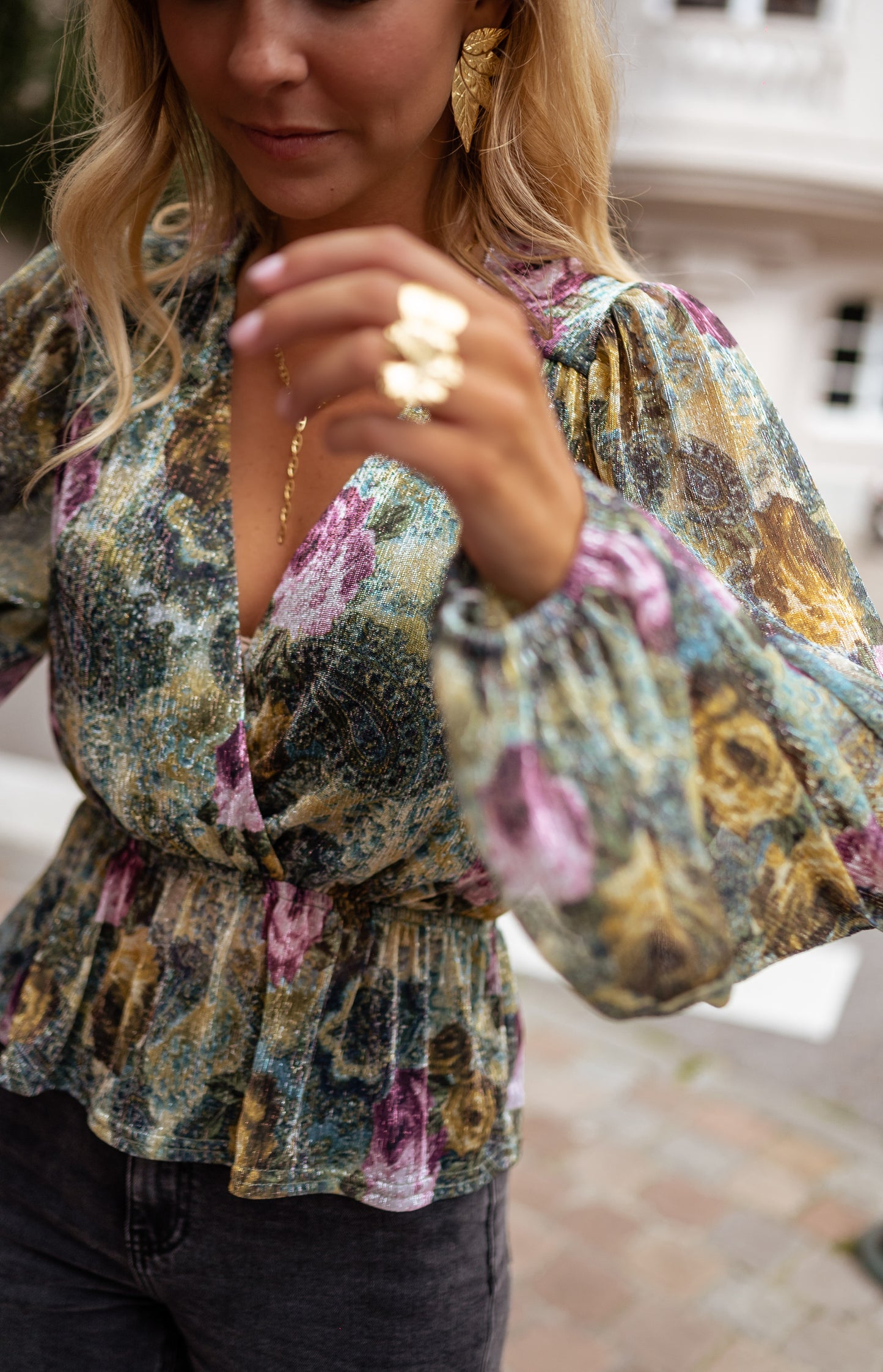 • Beautiful floral blouse with flowy long sleeves that have elastic on the wrists. This blouse has a dreamy v-neckline as well as a looser elasticity around the waist, in addition to lining on the bust. The edges of the blouse are crafted with silverly and golden colors. The perfect blouse that you can style up or down all season long no matter the occasion.