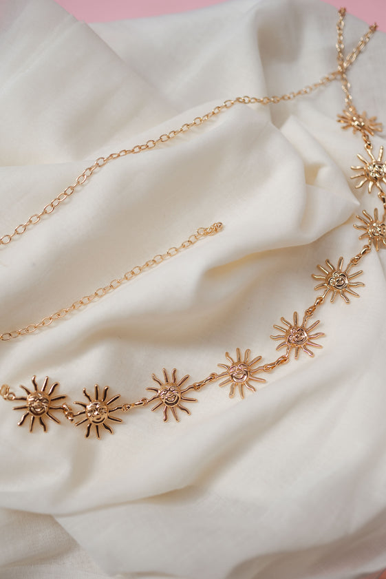 Shine bright with the Gold Sunna Belt, featuring radiant sun motifs in stainless steel with a polished gold finish. Adjustable for the perfect fit, it’s the ideal statement accessory for any outfit.