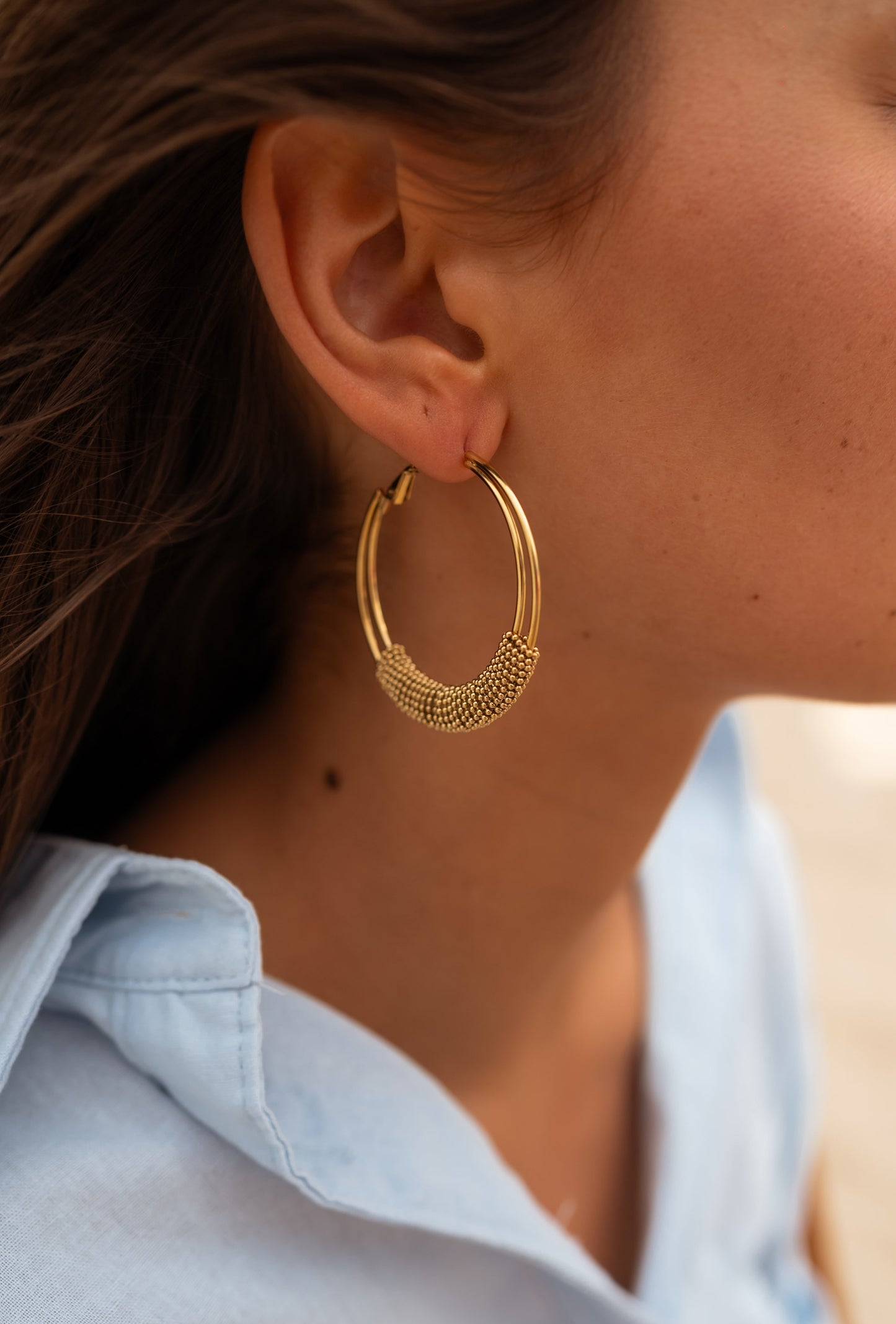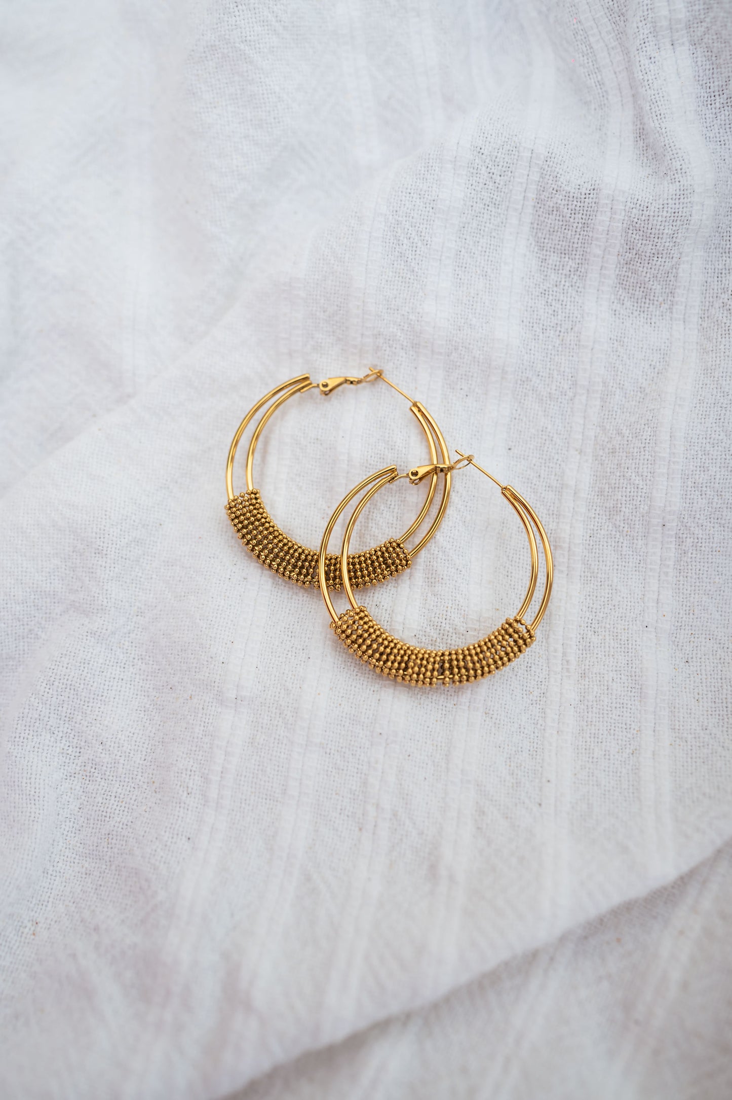 - Elevate your style with these exquisite hoop earrings in a stunning golden finish. Crafted from durable stainless steel, these earrings feature delicate bead detailing that adds a touch of elegance and sophistication.
