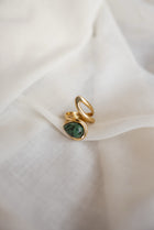 • The Golden Okana Ring brings a touch of bold serenity to your hand. Designed with a teardrop-shaped green stone set in a golden stainless steel band, this adjustable piece blends natural charm with modern shine. Wear it solo or stacked — either way, it stands out.
