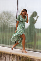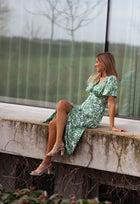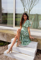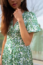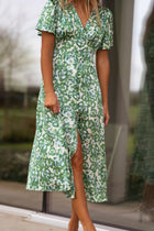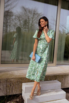 - Green patterned flowy, midi, short sleeve dress with buttons up the front, has a v-neck neckline and is a must have for this Spring and Summer! Perfect and so easy to dress up or down, day or night for any occasion!