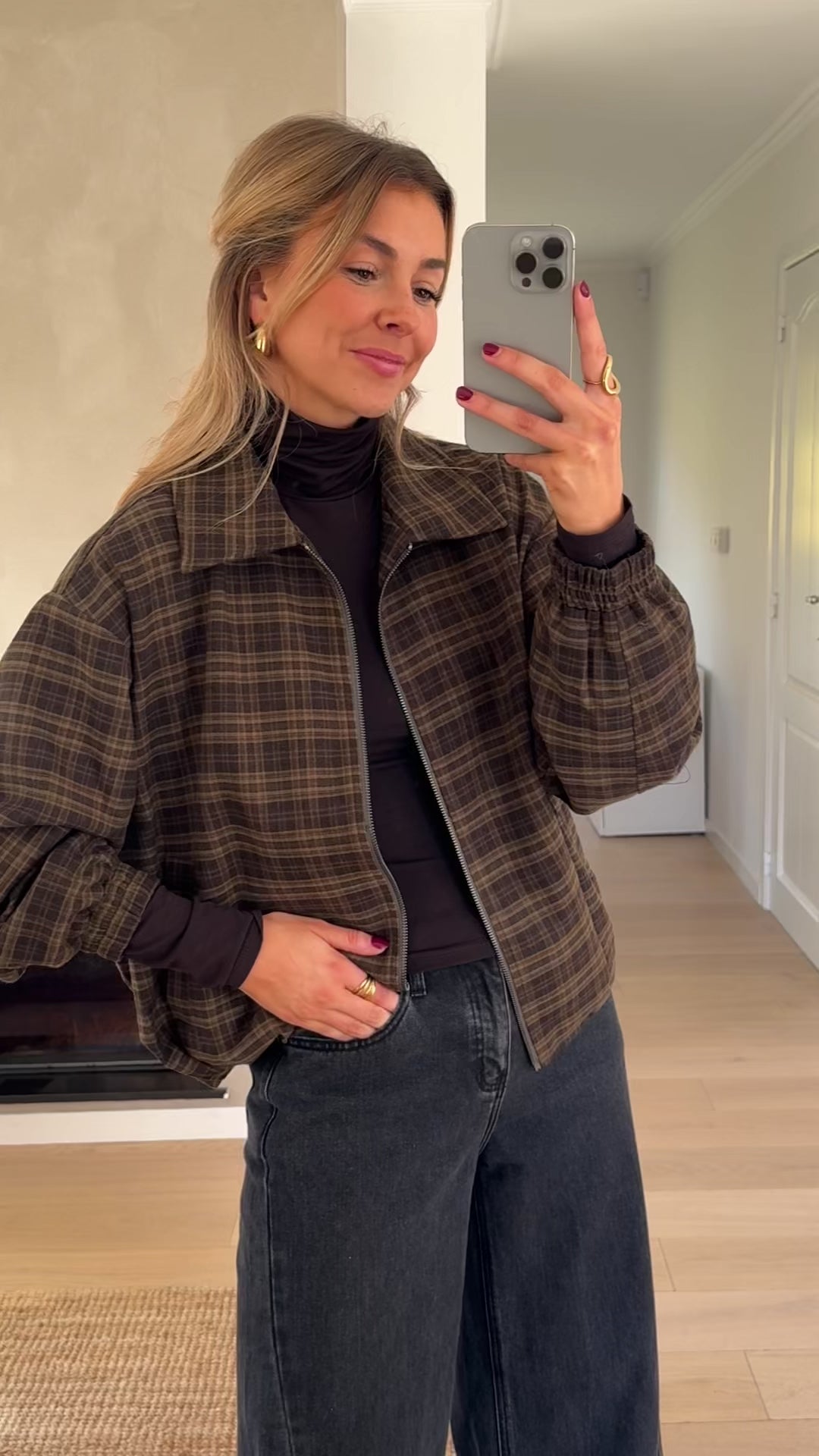 Add a statement layer to your look with the Khaki Checkered Philipa Jacket. Featuring checkered patterns, long sleeves with a slightly loose fit, and practical side pockets, this jacket blends comfort with style. Finished with a silver pull tab, it’s perfect for everyday wear and easy layering across seasons.