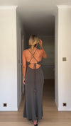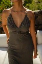 The Khaki Coco Dress blends a breezy linen blend fabric with eye-catching beaded straps. Featuring an open back, back ties, and a flattering V-neck, it's a chic and easy choice for sun-soaked days.