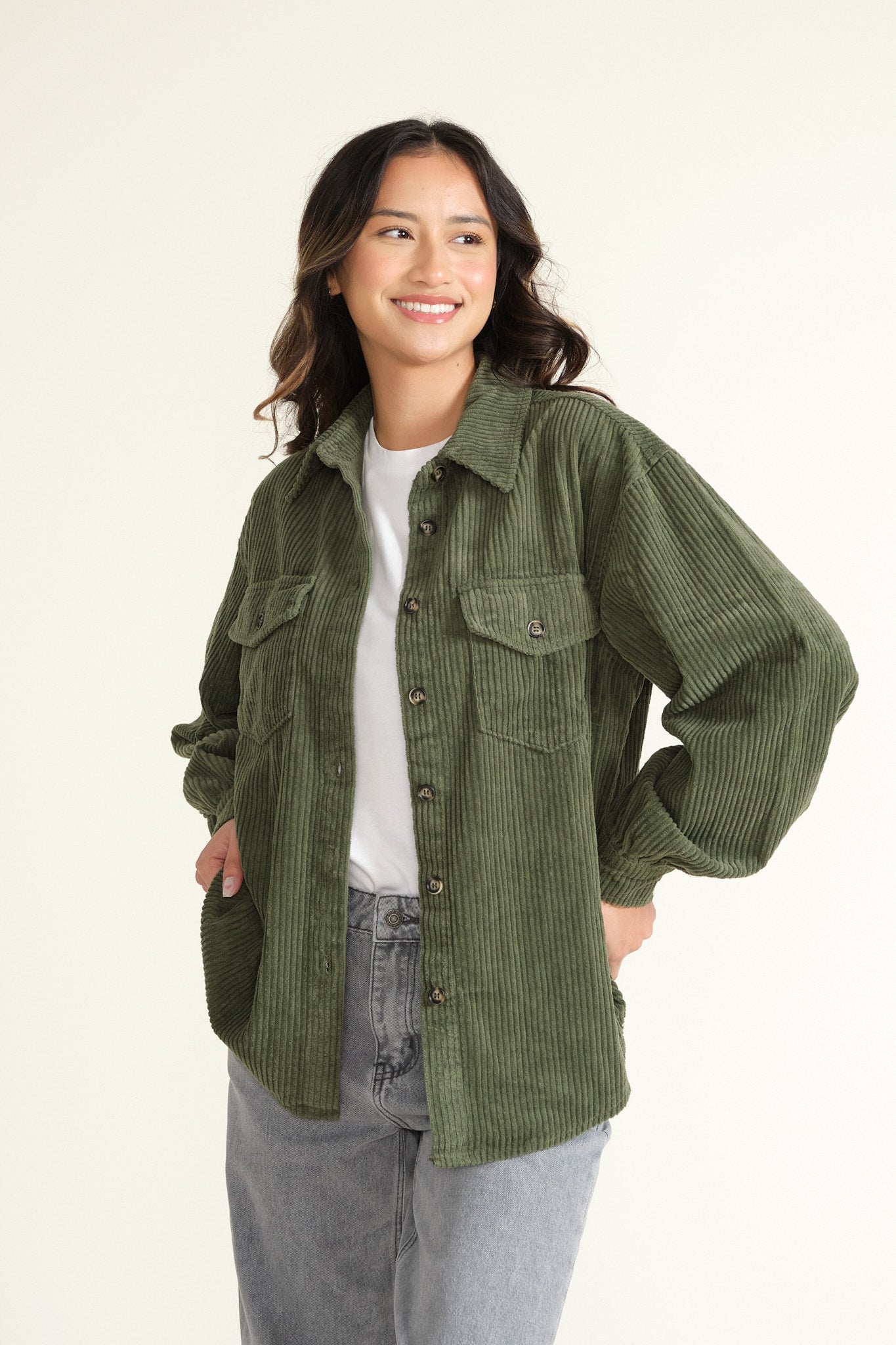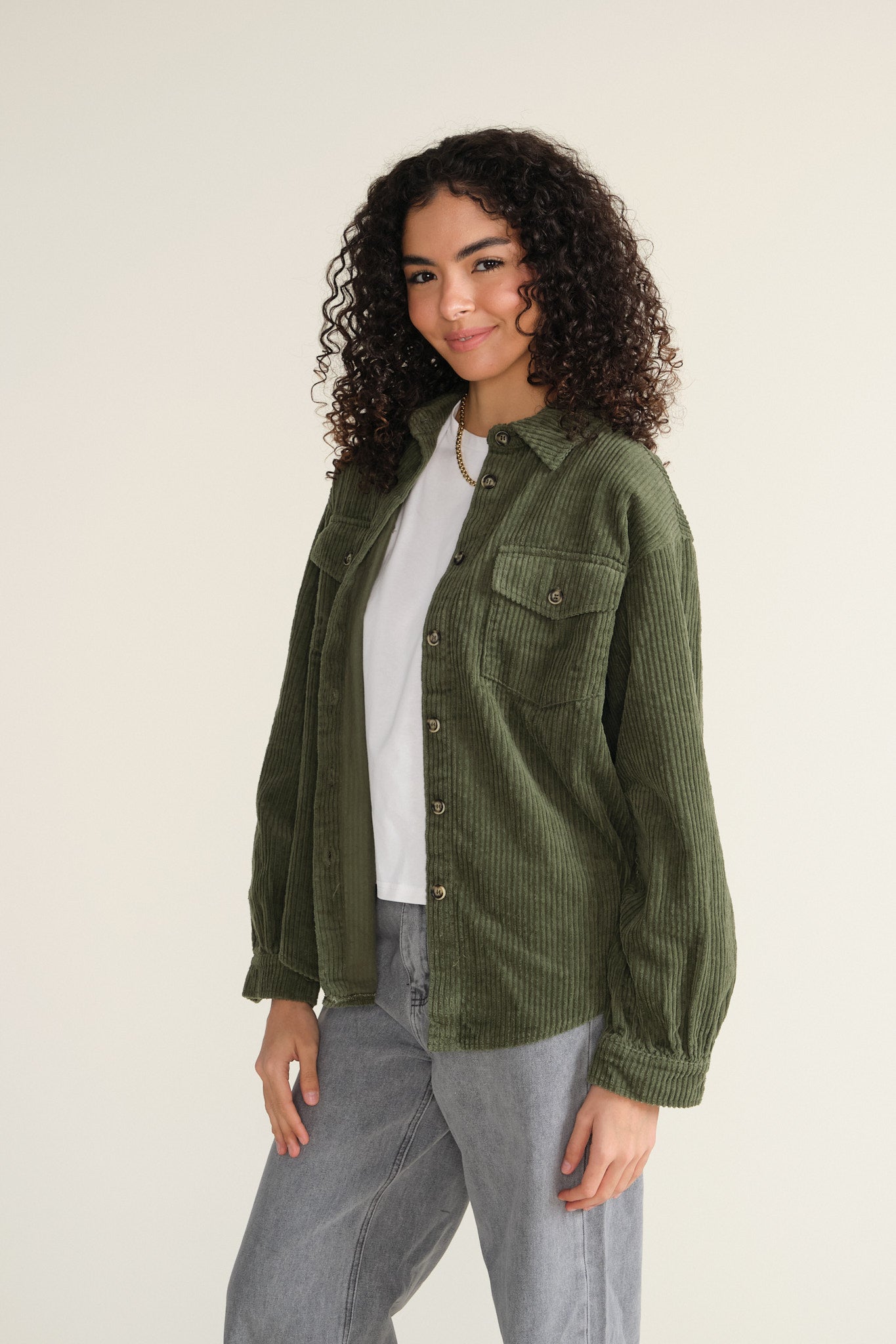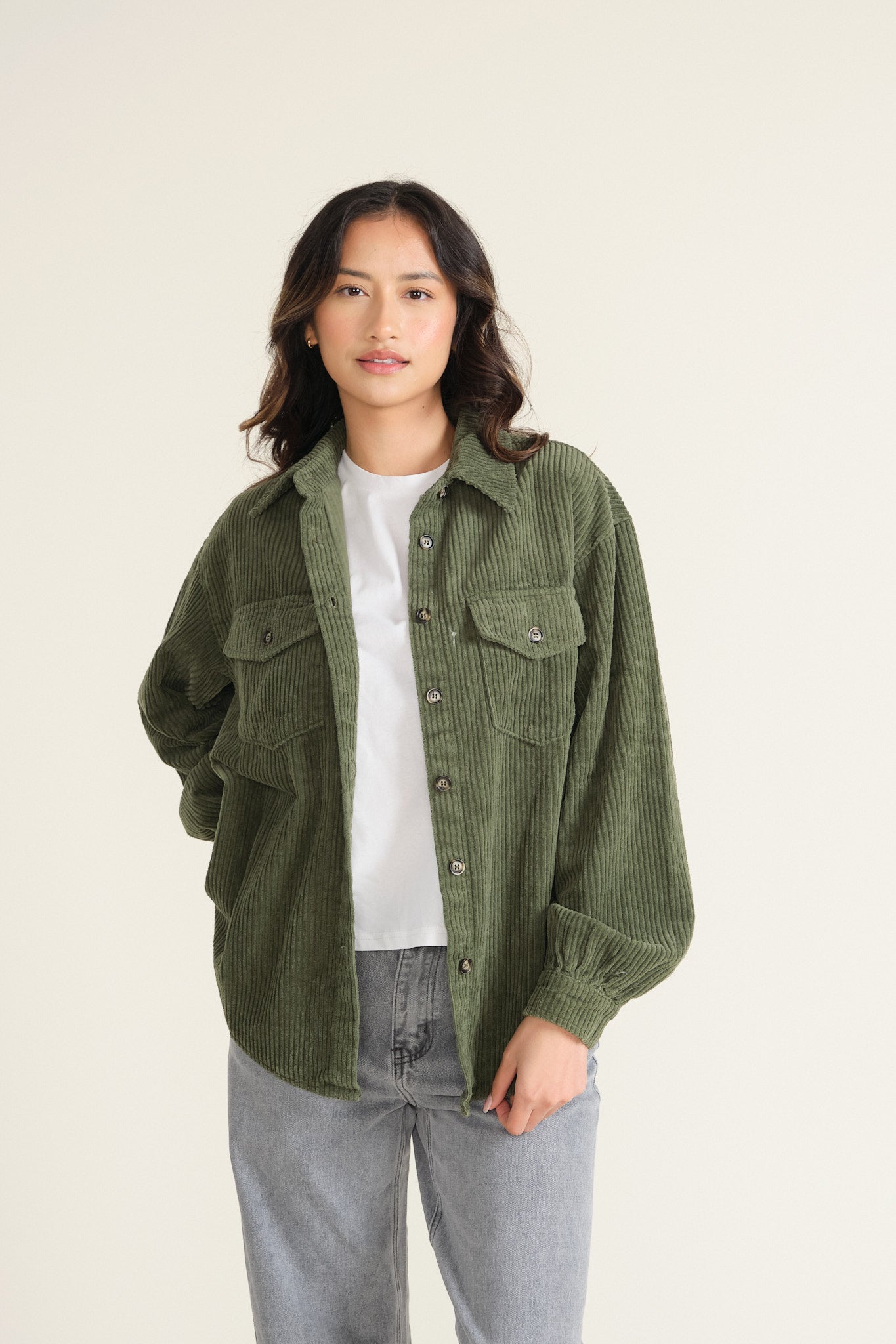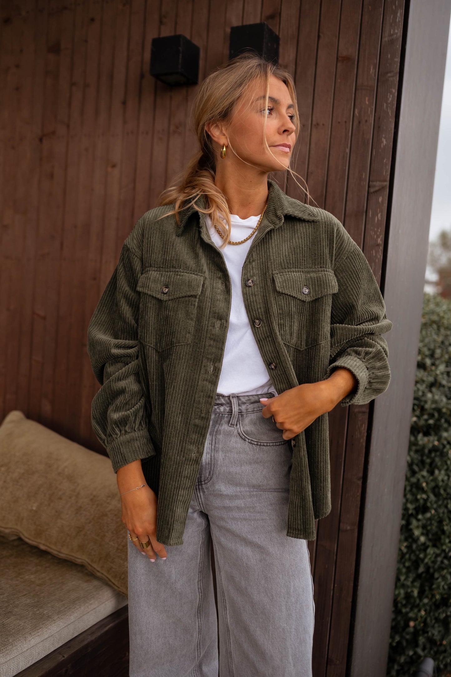 - The Khaki Louana Overshirt is made from soft corduroy fabric with a flowy, loose fit for ultimate comfort. Featuring detachable buttons, this versatile piece can be styled in multiple ways, perfect for layering or wearing solo. A must-have for casual and smart-casual outfits, offering both style and practicality in one shirt.