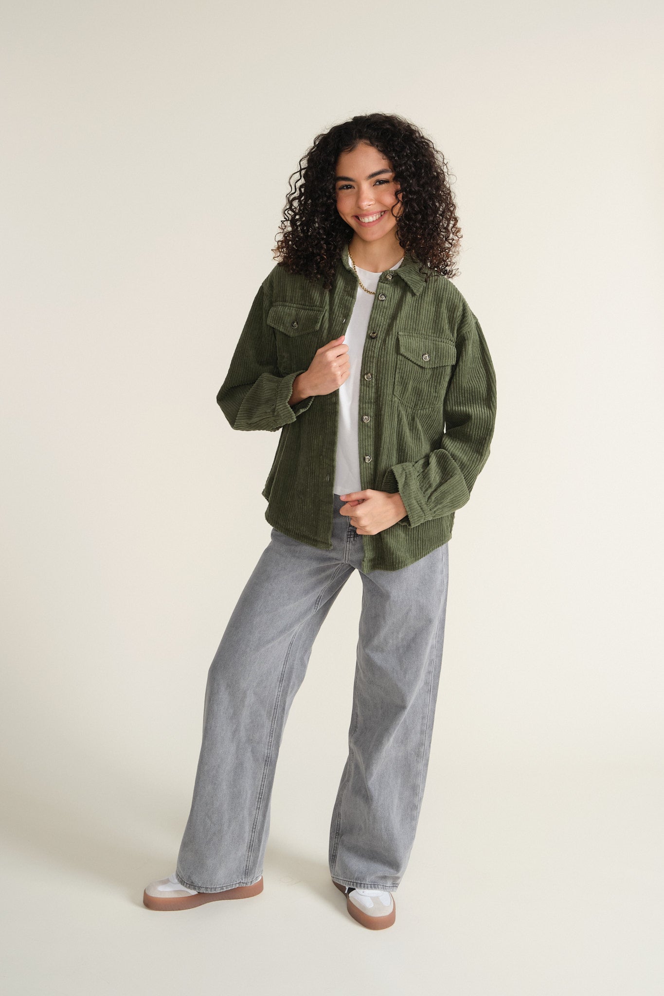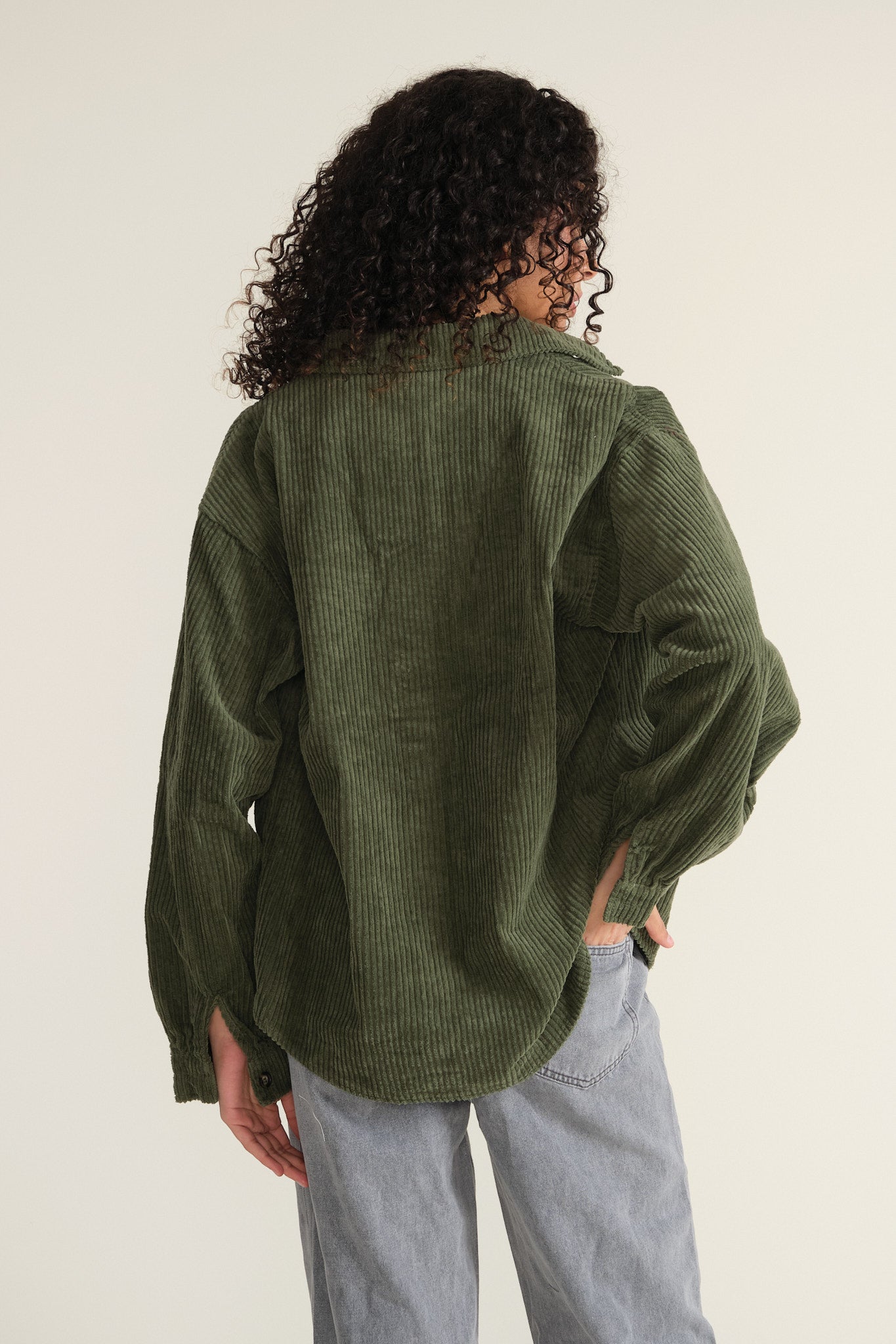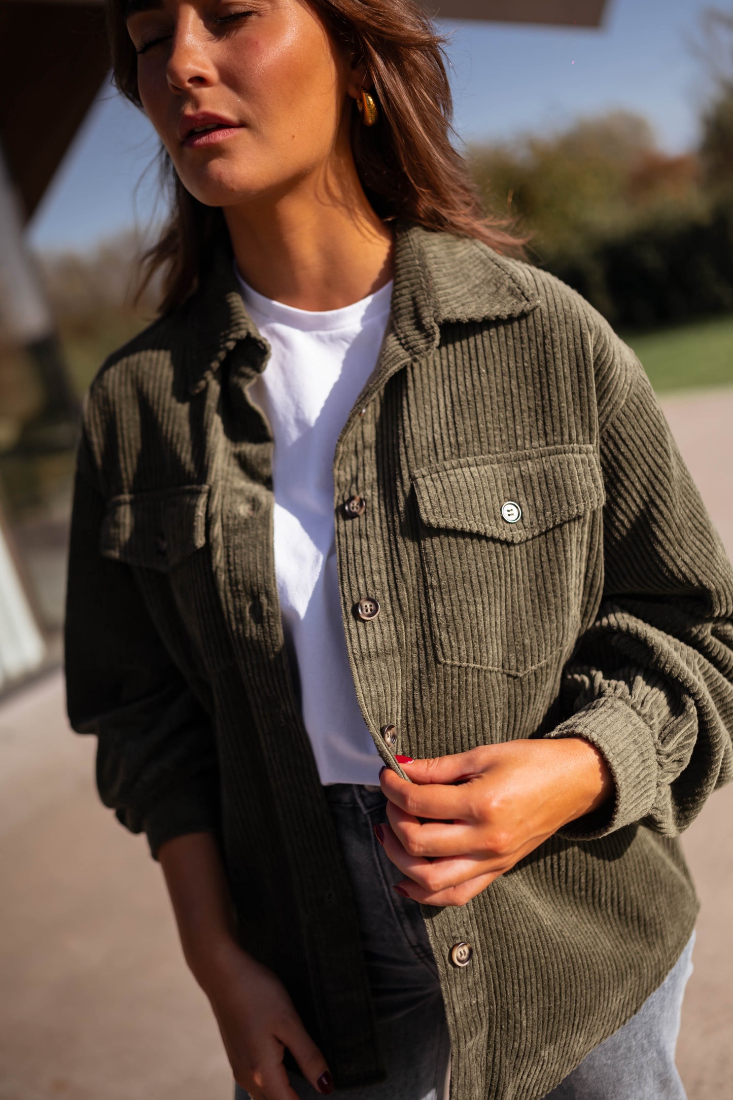 - The Khaki Louana Overshirt is made from soft corduroy fabric with a flowy, loose fit for ultimate comfort. Featuring detachable buttons, this versatile piece can be styled in multiple ways, perfect for layering or wearing solo. A must-have for casual and smart-casual outfits, offering both style and practicality in one shirt.