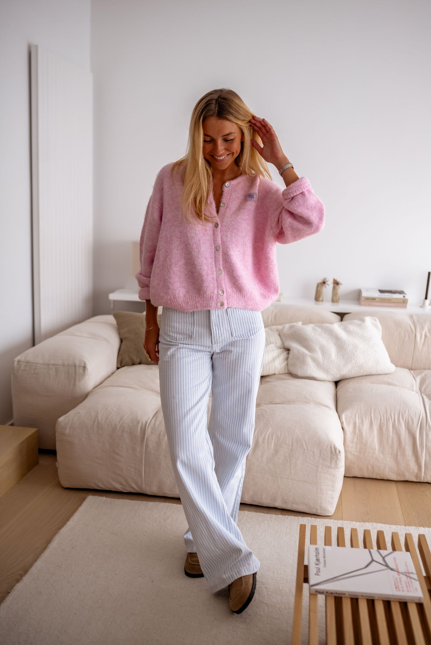 - Satisfy your fashion cravings with the Pink Harris cardigan! Featuring a charming "Self Love Club - Easy Clothes" label, this soft and slightly loose cardigan boasts long sleeves and pearly buttons running along its length. Elevate your wardrobe with this must-have piece.