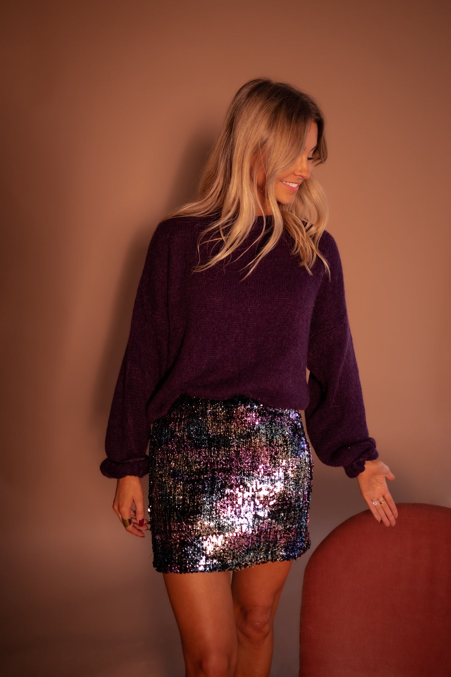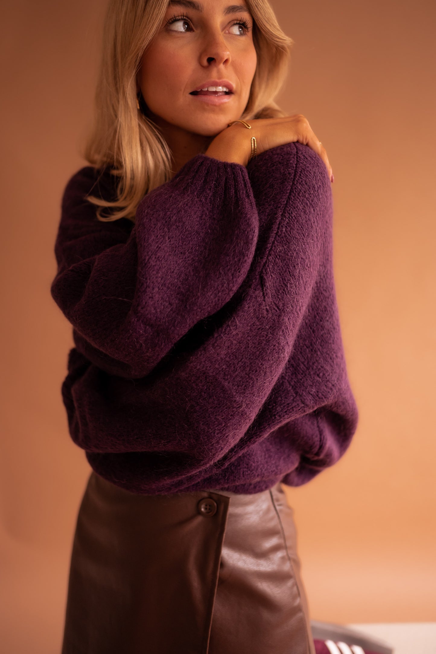 - Dreamy plum, long sleeve knit sweater that features a crewneck and will keep you warm and cozy while being chic and on trend all at the same time.