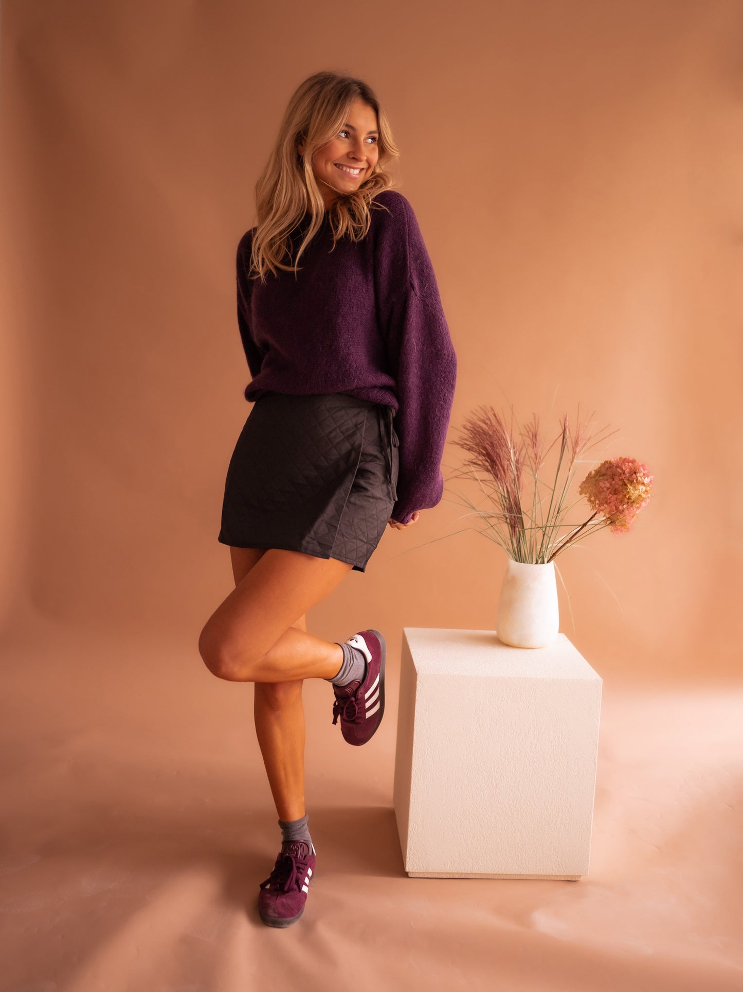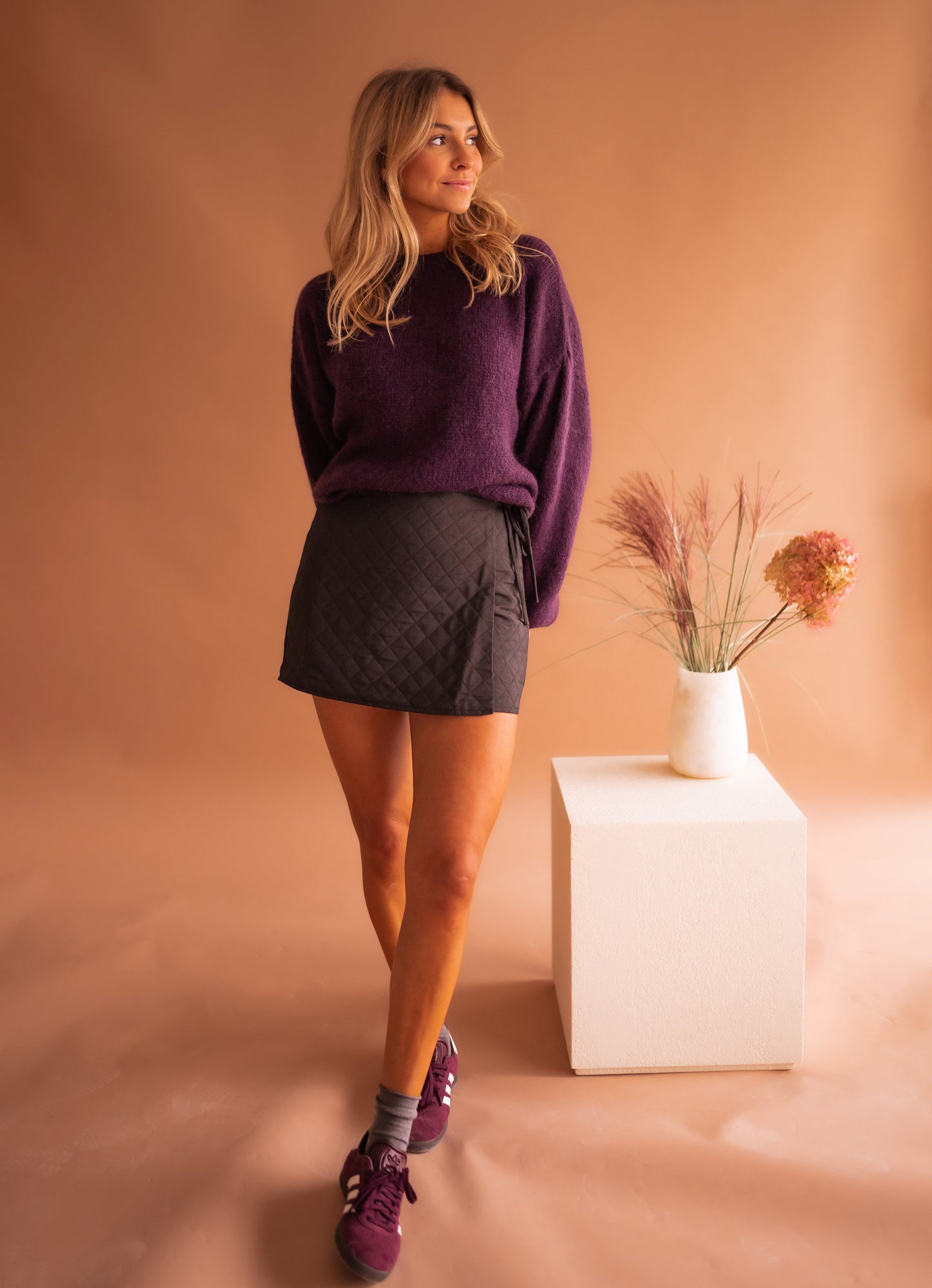 - Our model wears the Chocolate Faux-Leather Maeva Skirt, the Black Quilted Valentina Skort and the Glittery Adelyne Skirt