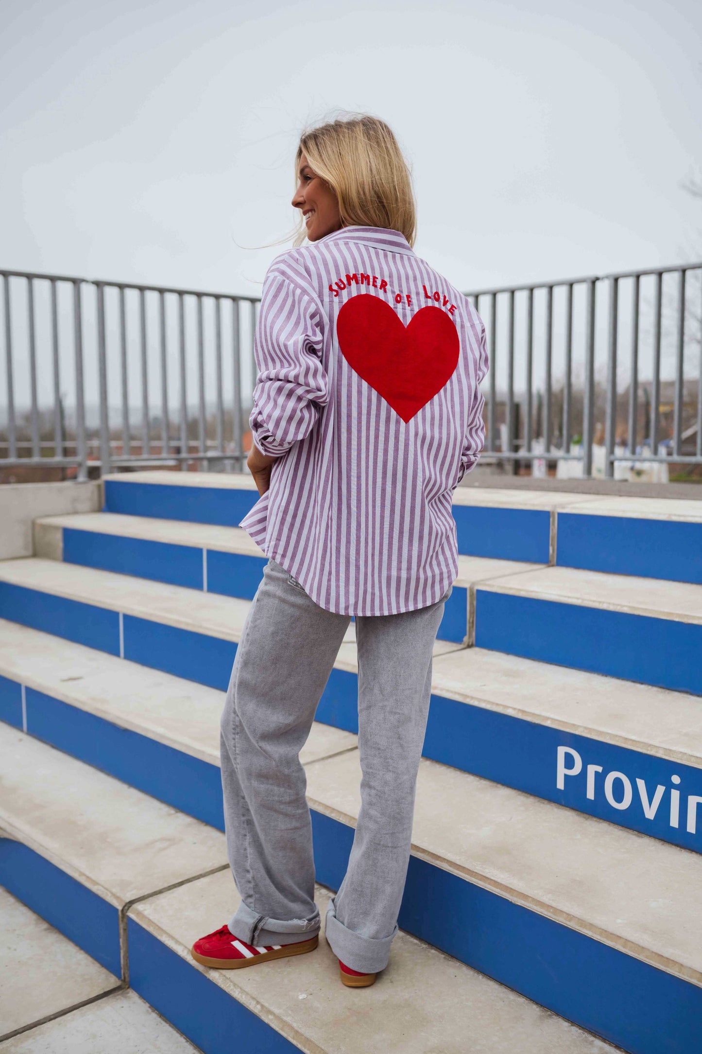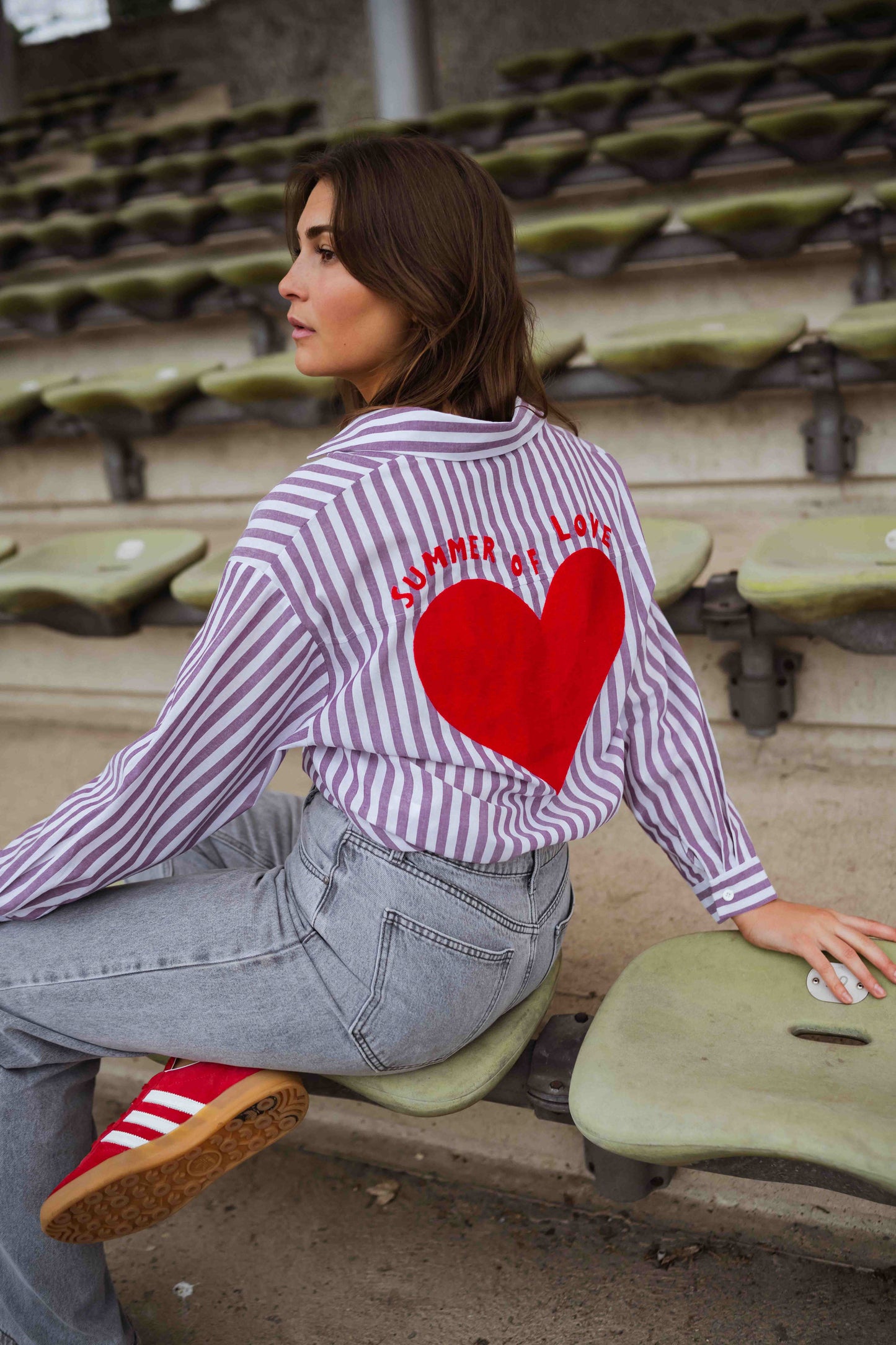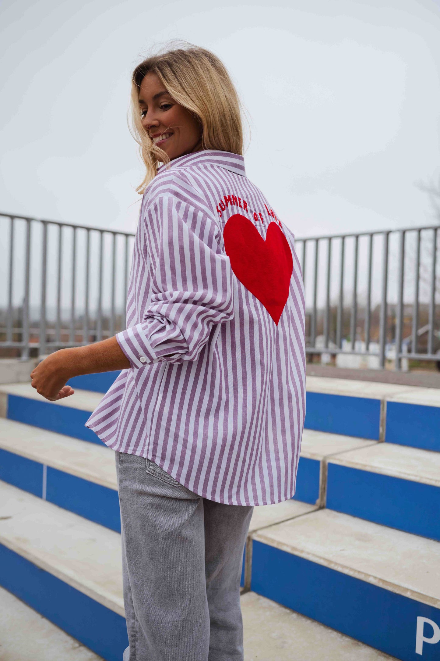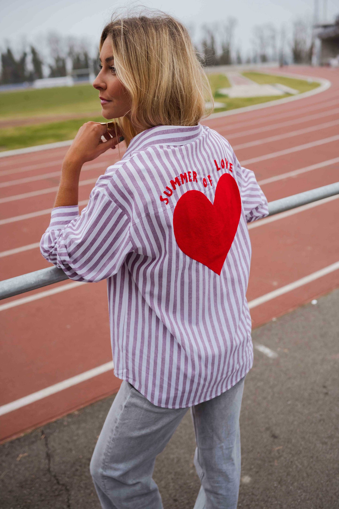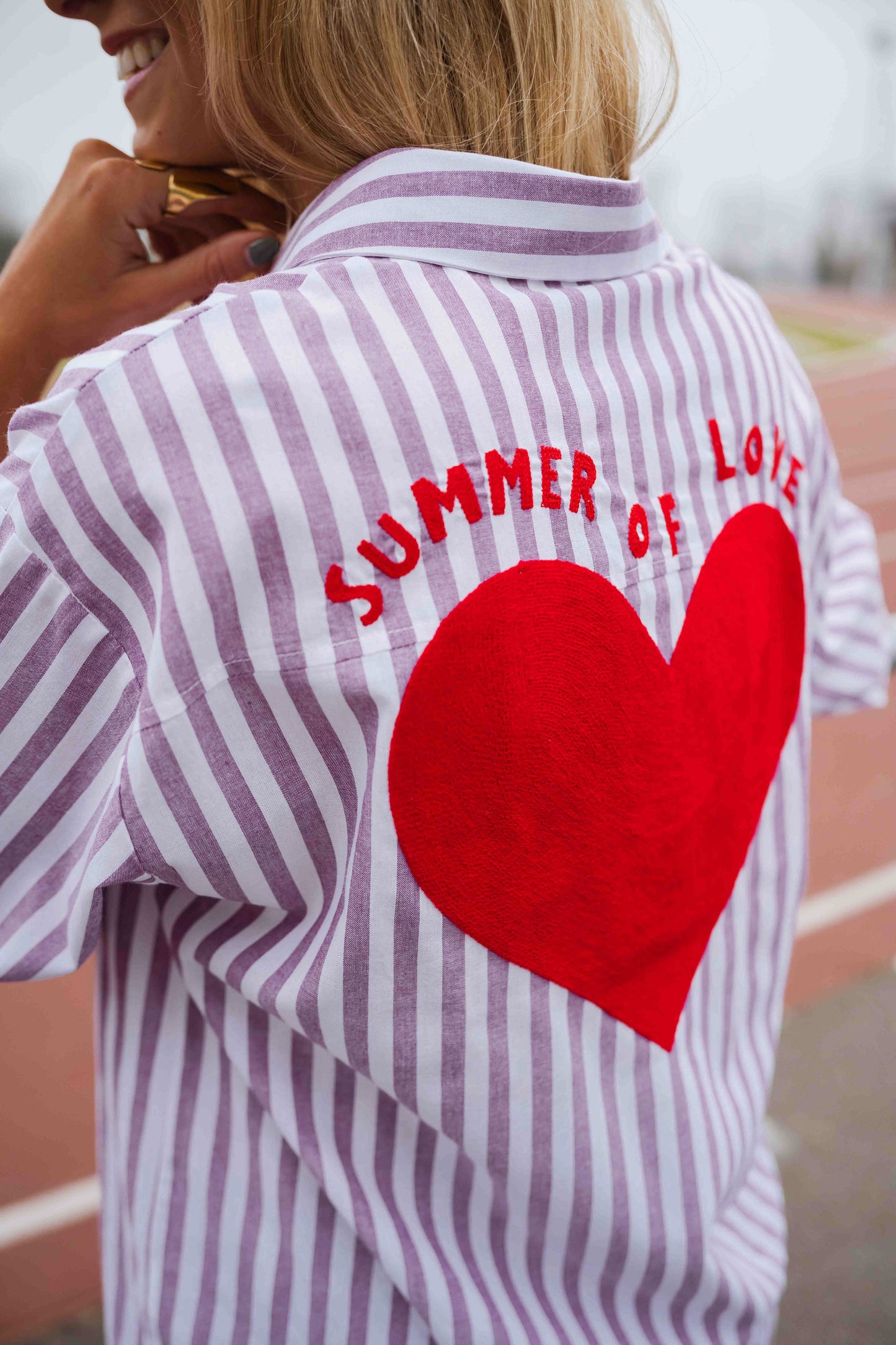 • A shirt that speaks for itself. The Purple and White Striped Meha Shirt features long sleeves, a classic lapel collar, and a relaxed fit that drapes with ease. Turn around to reveal a surprise: a vibrant red heart and "Summer of love" message dancing across the back. Light, fluid, and full of charm.