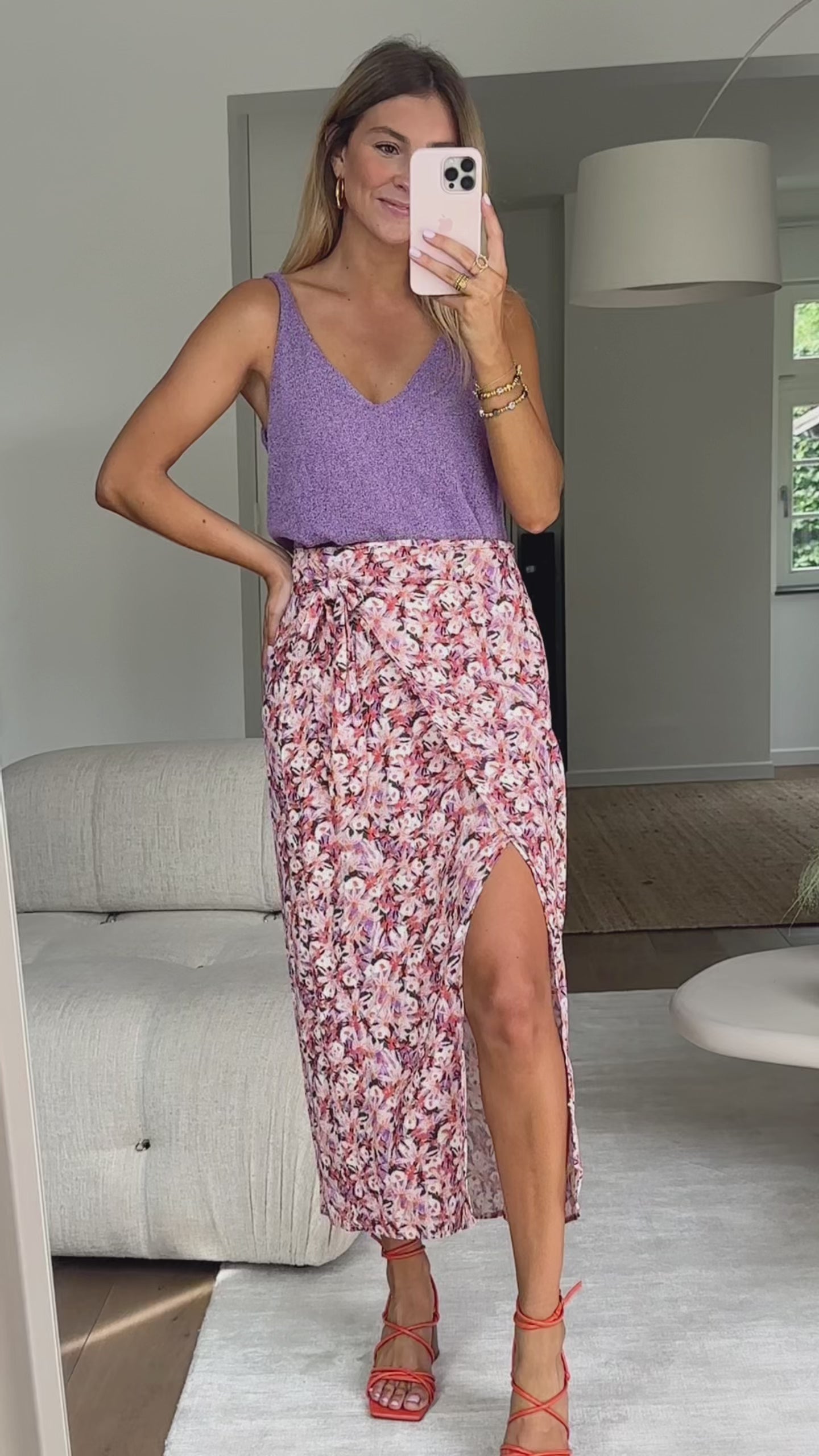 - Purple wool-effect top that has thin straps and paired with a beautiful v-neckline. The top also nice and flowy which is perfect for the summertime, as well as it is not lined and is slightly sheer. This is the perfect summertime top that can be worn with any bottoms.