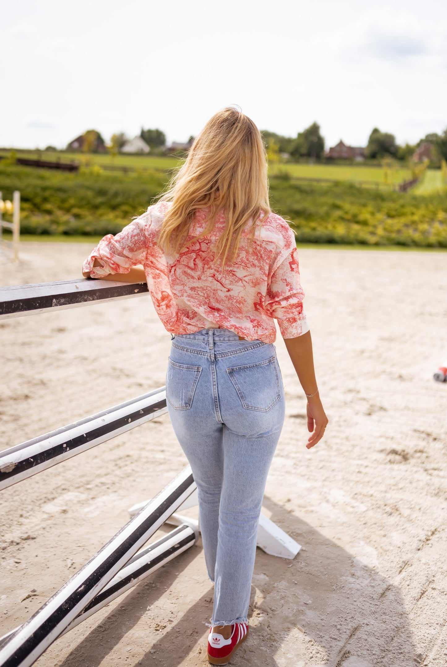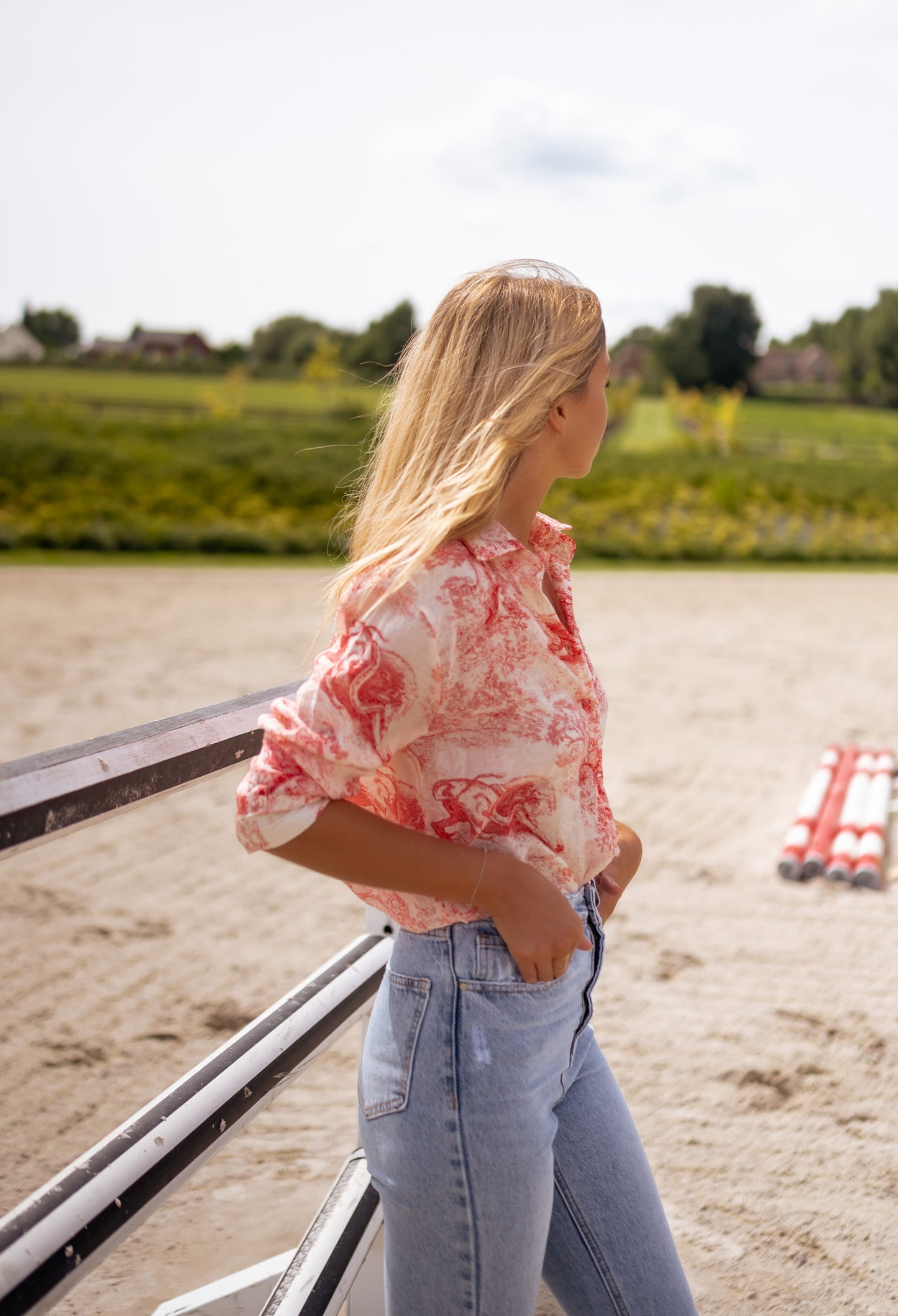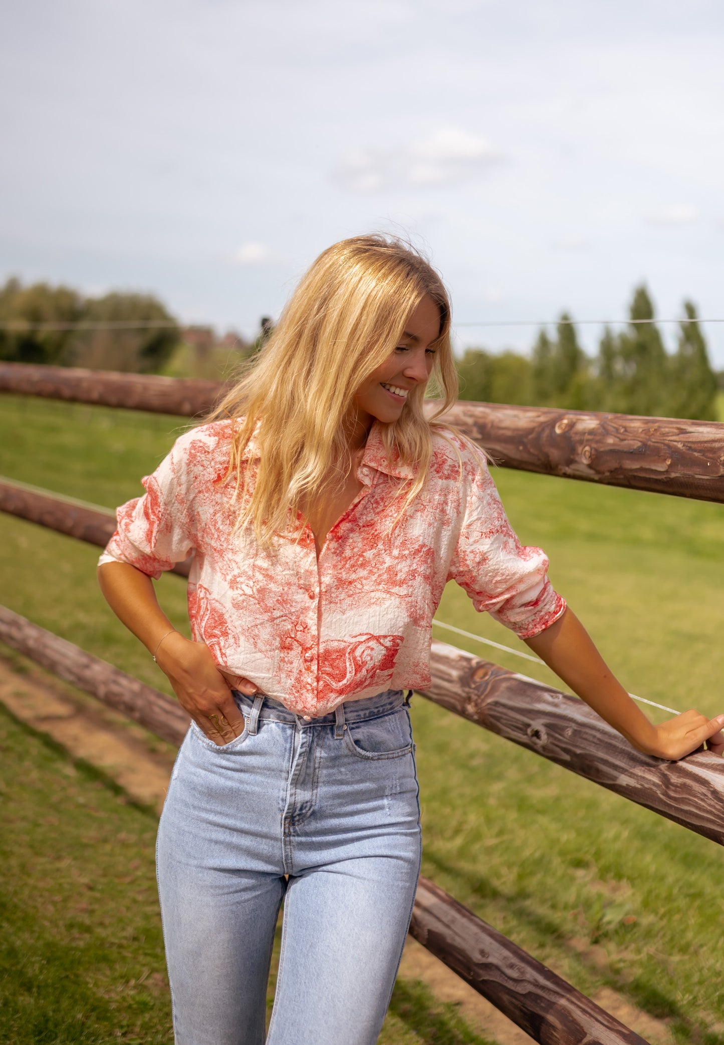 - Chic red patterned, long sleeve shirt that is paired with buttoning all along the front, in addition to it being soft and having flowy fit/structure. This shirt is slightly sheer (our model is wearing as skin tone bra/undergarment underneath). This shirt is perfect for transitioning from summer to fall!