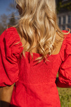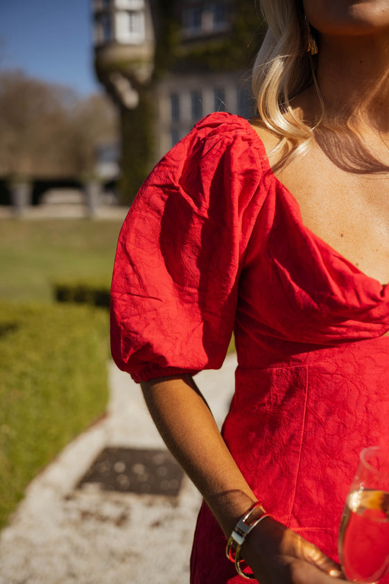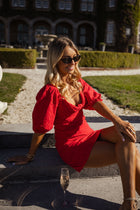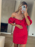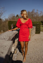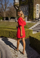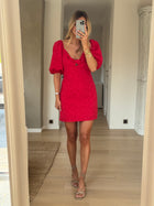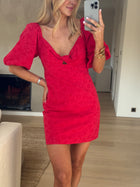 - Let your style speak volumes. The Red Mia Dress features soft balloon sleeves and a flattering v-neckline, bringing effortless charm to a classic mini cut. It’s the kind of piece that does the talking so you don’t have to.