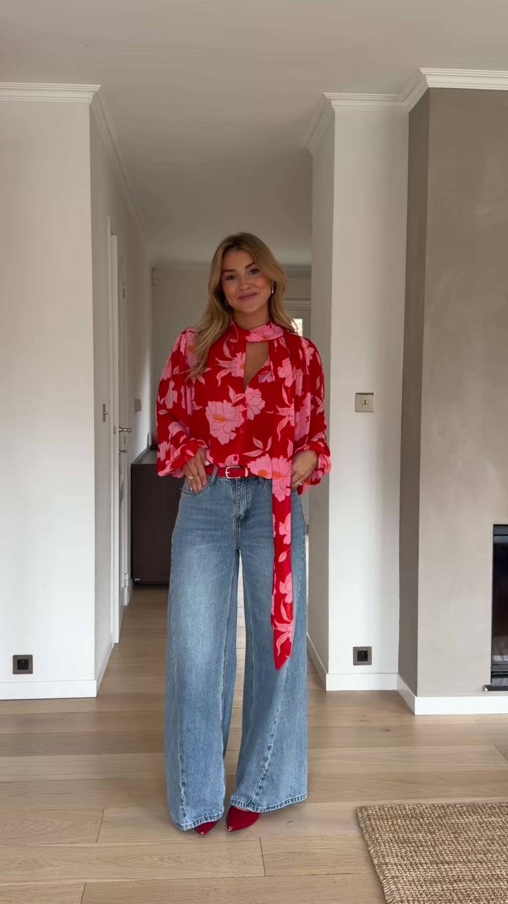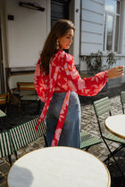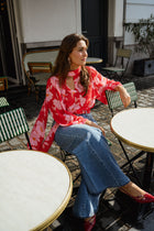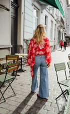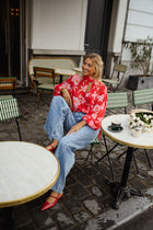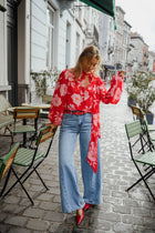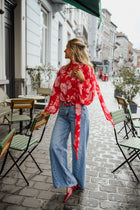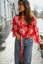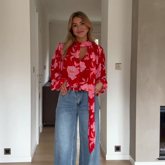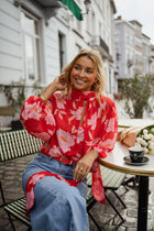 Bold yet fluid, the Red Patterned Georgina Blouse brings movement and elegance through its lightweight, slightly sheer fabric and all-over pattern. The neck-bow collar adds a refined, feminine touch, while long sleeves with elasticated cuffs create soft volume. Unlined for an airy feel, the Red Patterned Georgina Blouse is a statement piece that remains effortless and easy to wear. Our models wear the blue Guetta and jeans