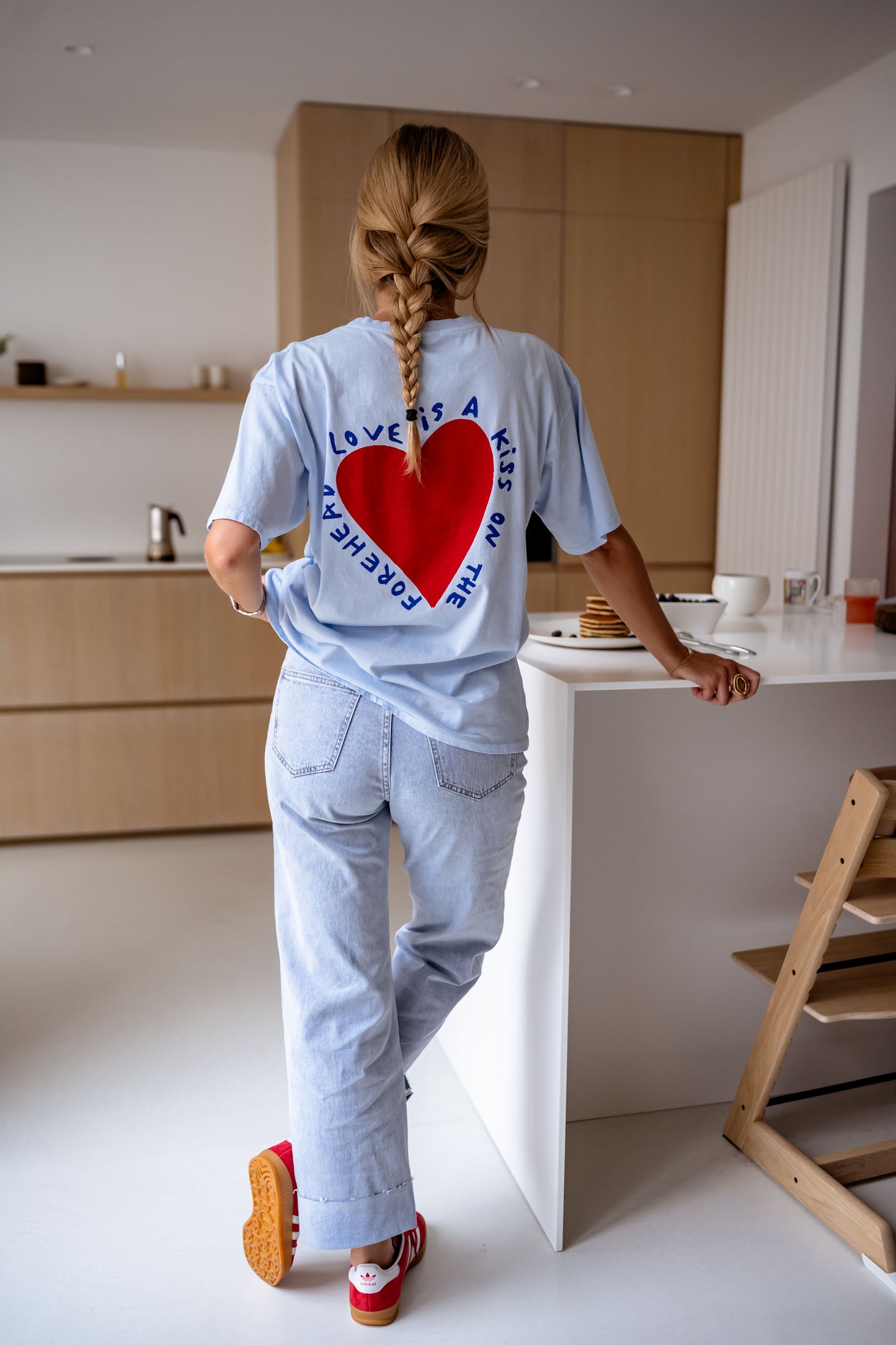 - Add a touch of charm to your everyday style with the Sky Blue Mona T-Shirt. Designed with a classic crewneck and short sleeves, this slightly loose-fit tee offers all-day comfort. The heart-shaped logo with blue writings adds a playful yet stylish detail, making it a must-have for effortless casual looks.
