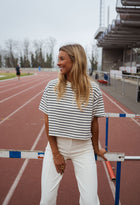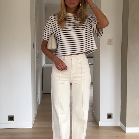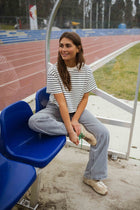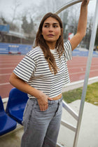 - Step up your style game with the Striped Jouri T-Shirt. Its slightly cropped design and navy blue stripes bring a fresh, fun vibe to any outfit. The classic crewneck ensures comfort while keeping you effortlessly chic. Pair it with your favorite jeans or skirt for a go-to look that’s both stylish and easy to wear.