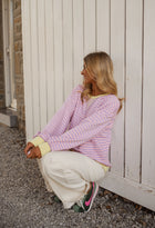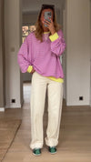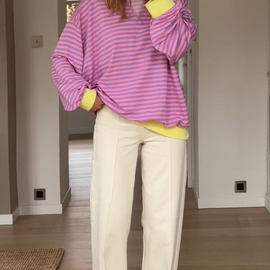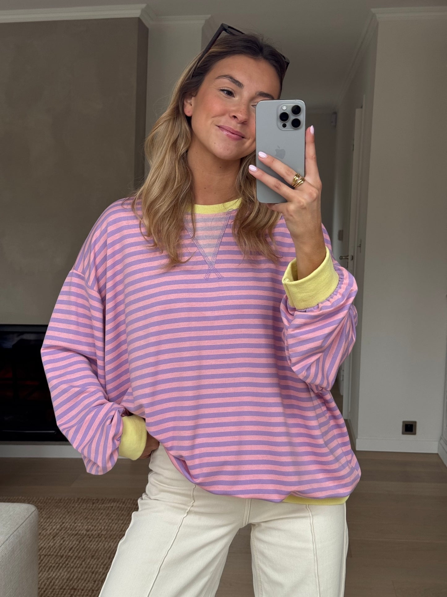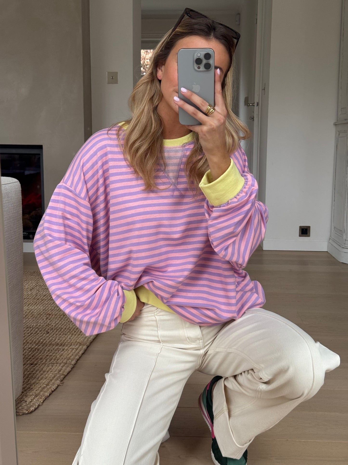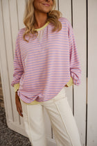 Bold stripes meet laid-back comfort in this loose-fit sweater featuring long sleeves, a classic crewneck, and standout yellow accents on the collar and wrists.