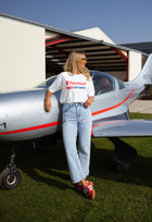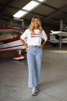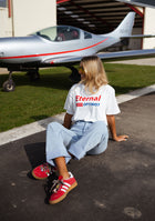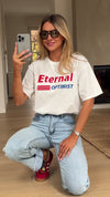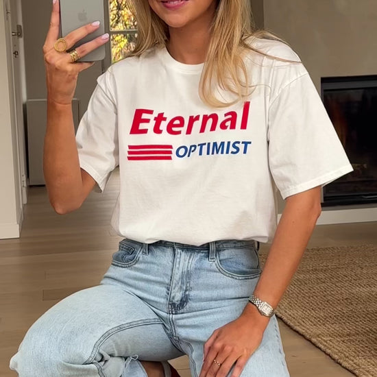 • Crafted for comfort and style, the White Eternal T-shirt features a classic crewneck and short sleeves. The bold red and blue “Eternal Optimist” logo adds a vibrant touch to this slightly loose-fitting tee, making it the perfect addition to any casual outfit.