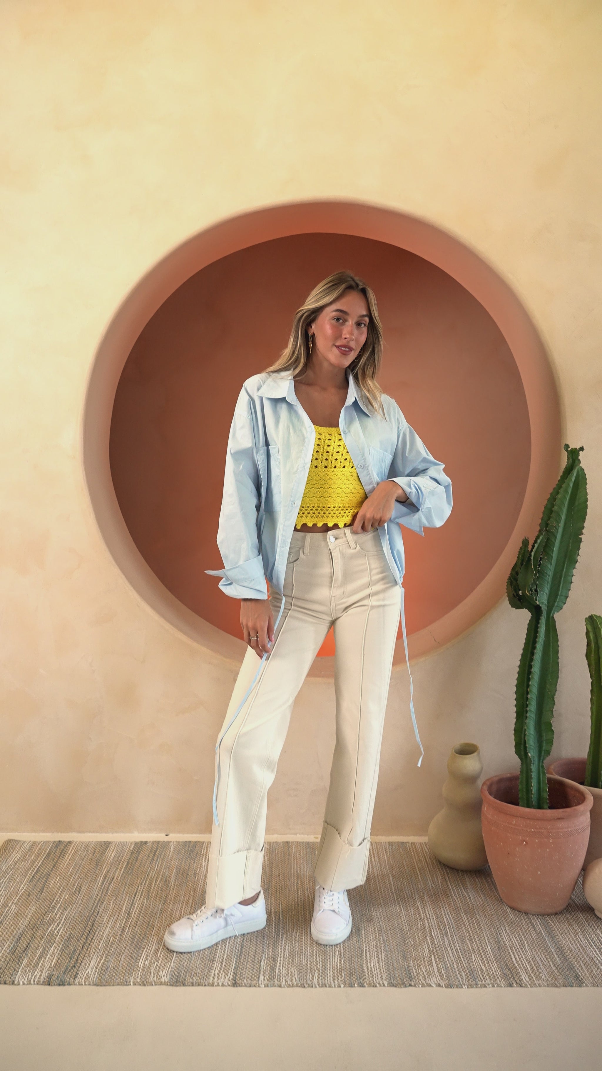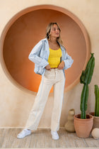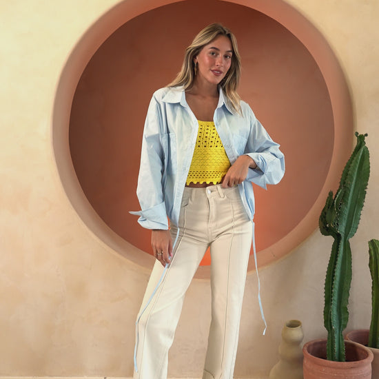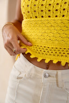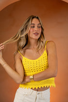 Bring a burst of sunshine to your wardrobe with the Yellow Duffy Top. Designed in airy crochet with delicate straps, this sleeveless, slightly cropped piece has a light semi-sheer finish that feels playful, feminine, and perfect for warm days.