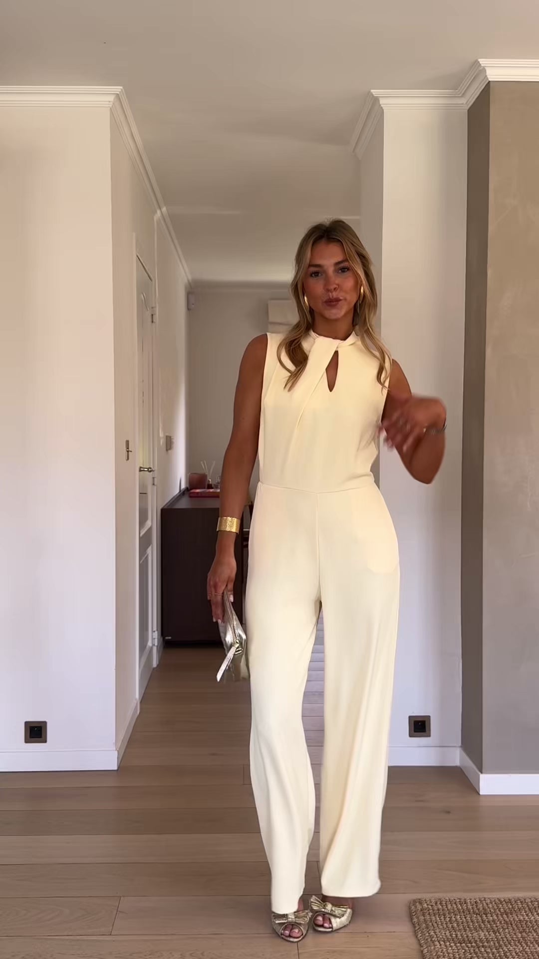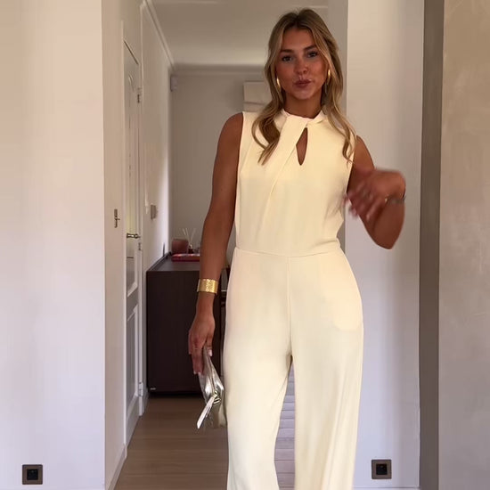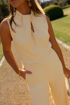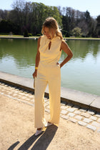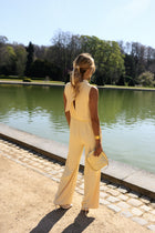 Elegant with a fluid, elongated silhouette, the Yellow Jess Jumpsuit is designed to flatter through its softly draped crossover neckline and subtle front opening. The sleeveless cut keeps it light, while the open back adds a refined, unexpected touch. A side zipper ensures a clean fit, and the unlined finish keeps it comfortable and easy to wear. Made in Italy, the Yellow Jess Jumpsuit is a polished statement piece with effortless flow.