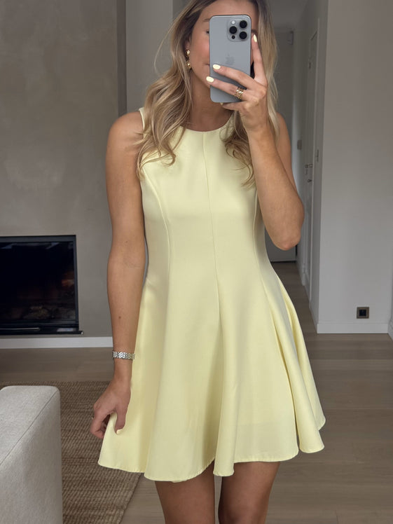 Brighten up your day with the Yellow Melissa Dress. This playful mini dress features a flattering skater silhouette with a pleated skirt that moves beautifully with every step. Designed with a classic crewneck, hidden back zipper, and full lining for comfort and ease.