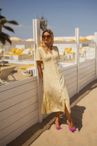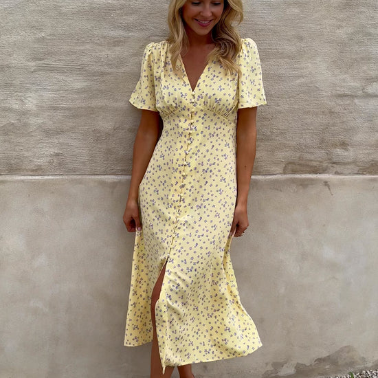 - Simple yet chic, the Yellow Sutton Dress brings a fresh glow to your wardrobe. With a soft satin effect, V-neckline, and button-down front, it flatters effortlessly. The gently cinched waist and short sleeves make it an easy favorite for daytime to evening wear.